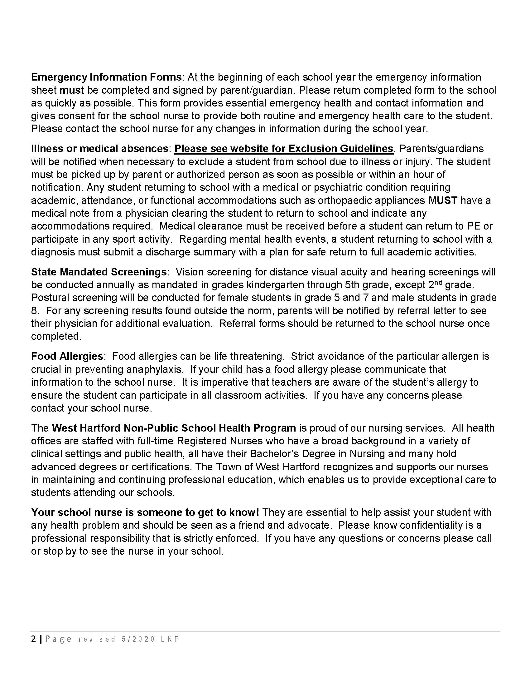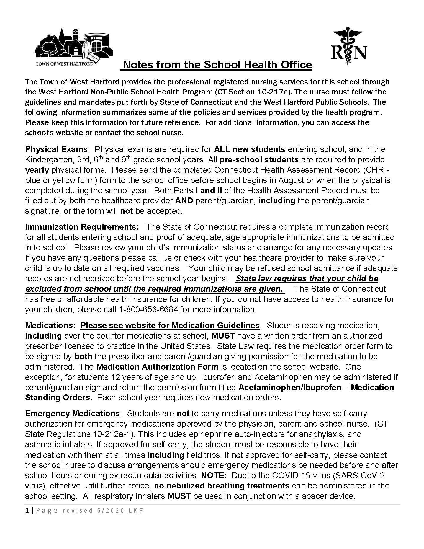 Our Nursing Services for our West Hartford Campus are provided by The West Hartford Non-Public School Services. Their school health program works with the West Hartford-Bloomfield Health District and Medical Advisor, Dr. Neil Stein, to accurately delineate what actions, if any, are required. Their goal is to promote the health of your child and the entire school community. For questions or to submit health forms, email Nurse Lisa at [email protected]