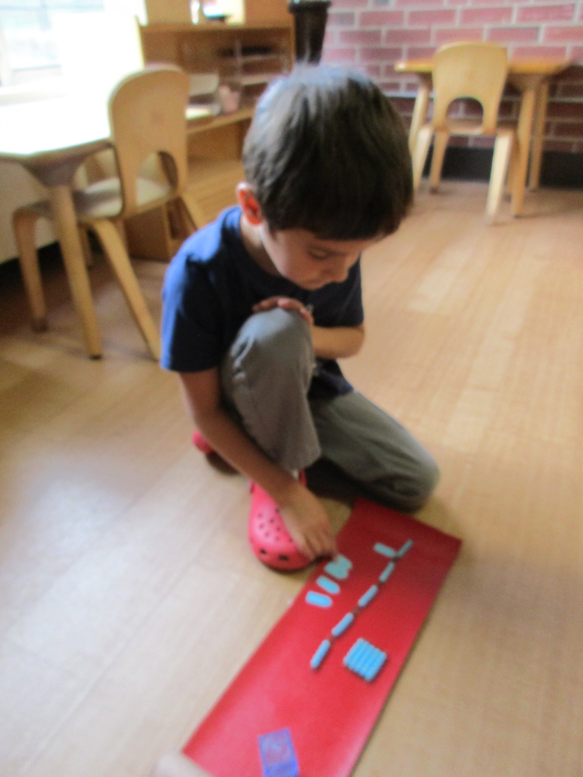 After a child has exhausted the Sensorial materials – absorbed the essence of the material so to speak -- they begin to work with the Math materials designed to help the child understand the numbers 1 through 10. Mastery includes: applying numeric symbols to appropriate quantities, counting in order, distinguishing between odd and even numbers, and understanding that zero represents “nothing.” (Understanding that zero is also a place holder comes later.)