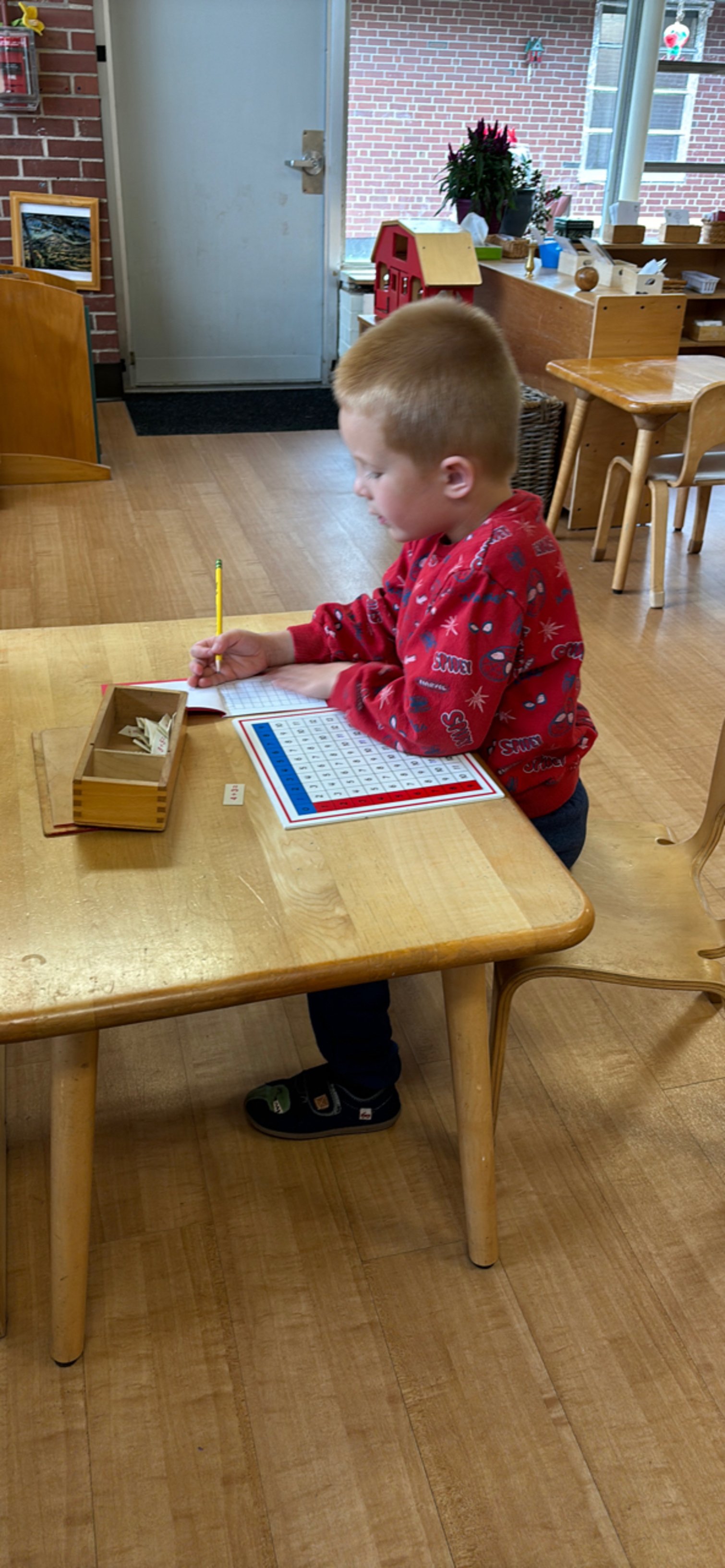 The children may dip back into earlier materials to solidify what they already know and strengthen connections. They extend their work with earlier materials. They are also introduced to various materials that help them memorize math facts. And they work on writing their numbers.