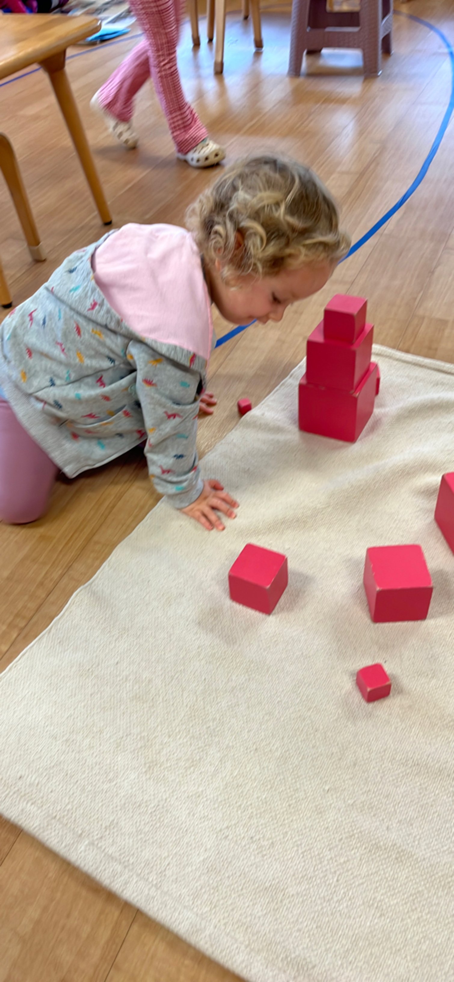 The Sensorial materials provide a direct bridge to the Math materials in the classroom. The math-related Sensorial materials include the Red Rods, the Brown Stair, the Pink Tower and the Solid Cylinder Blocks. These materials introduce mathematical concepts in their most concrete form. For example, the Red Rods provide a hands-on introduction to length, the Brown Stairs to width, the Pink Tower to volume, and the Cylinder Blocks to width, height, length and breadth.